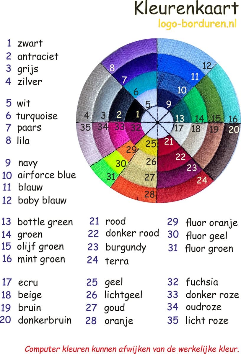 Kleur garen om de naam te borduren | Zonder bordruing, 1 zwart, 2 antraciet, 3 grijs, 4 zilver, 5 wit, 6 turquoise, 7 paars, 8 lila, 9 navy, 10 airforce blue, 11 blauw, 12 baby blauw, 13 bottle green, 14 groen, 15 olijf groen, 16 mint groen, 17 ecru, 18 beige, 19 bruin, 20 donkerbruin, 21 rood, 22 donker rood, 23 burgundy, 24 terra, 25 geel, 26 licht geel, 27 goud, 28 oranje, 29 fluor oranje, 30 fluor geel, 31 fluor groen, 32 fuchsia, 33 donker roze, 34 oudroze, 35 licht roze |