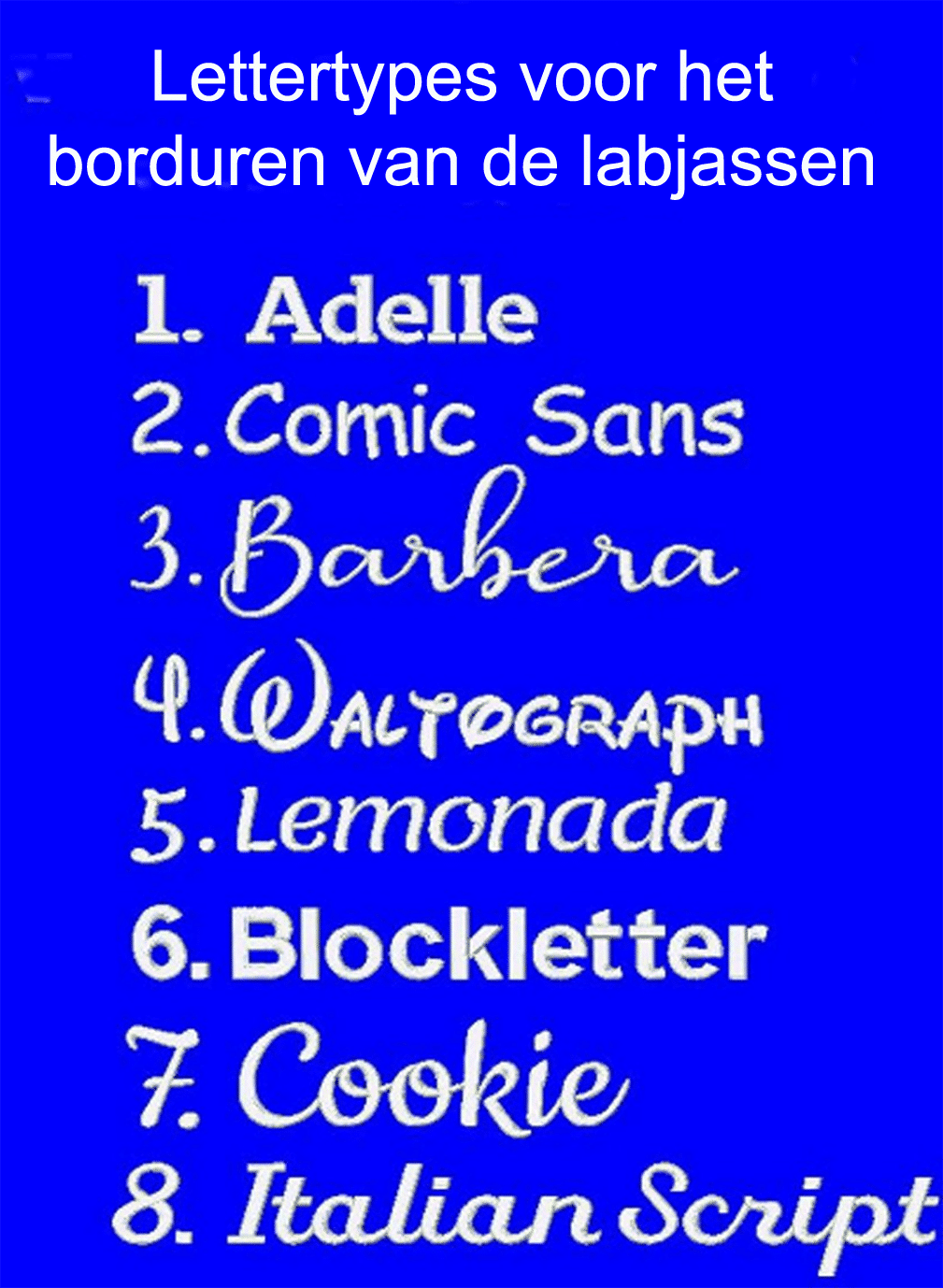 Lettertype | Zonder borduring, Adelle, Comic Sans, Barbera, Waltograph, Lemonada, Blockletter, Cookie, Italian Script |